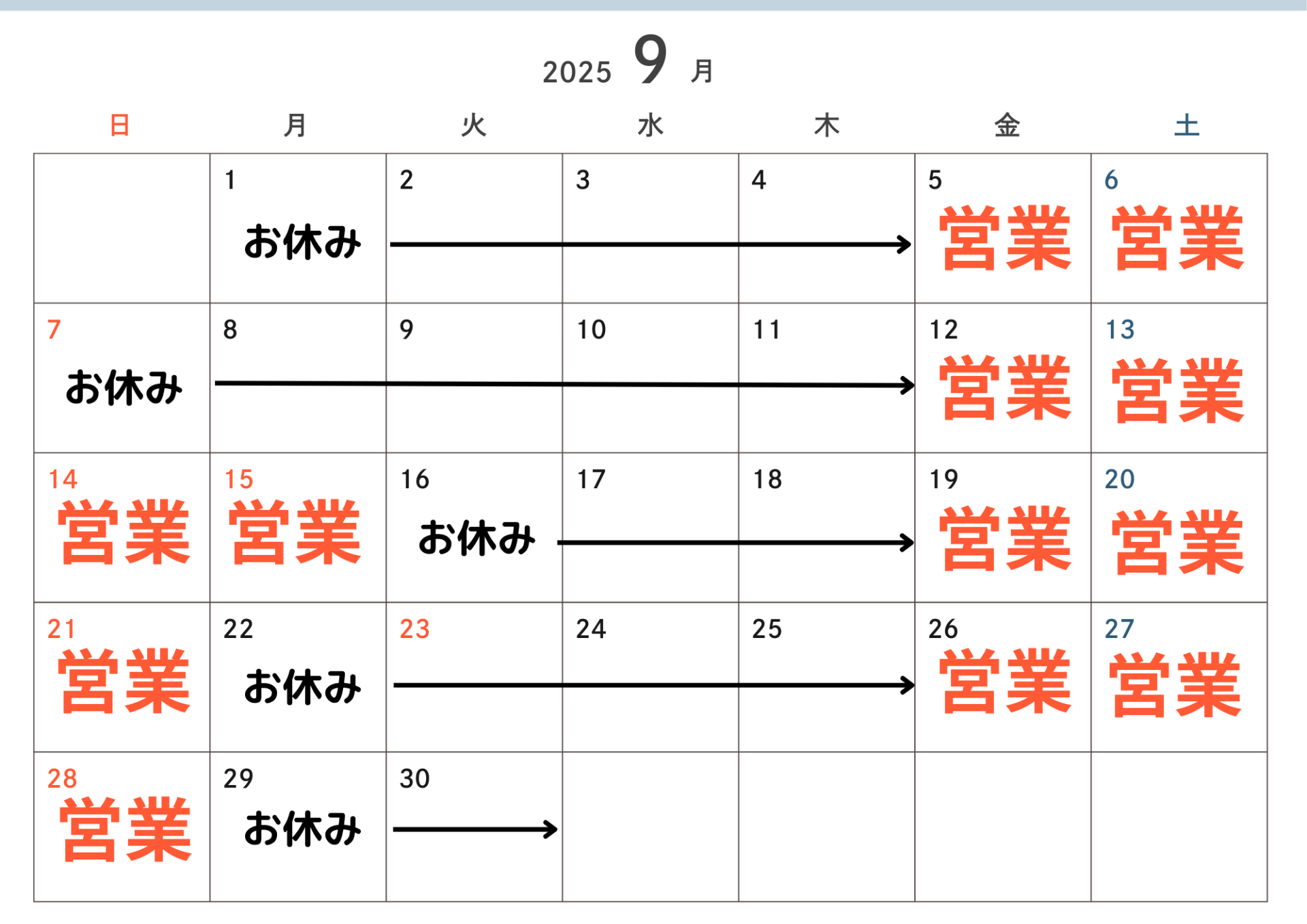 | 9月の営業日と定休日の表を | |||||